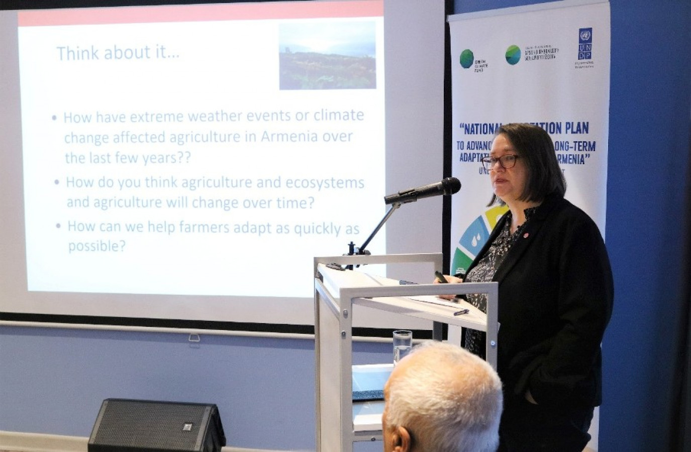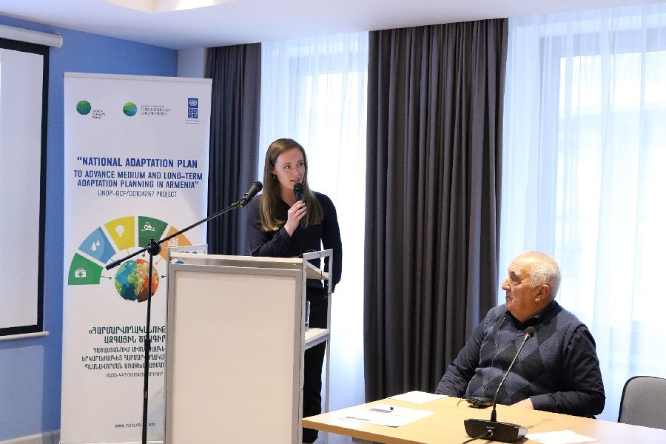 Diana Harutyunyan, UNDP in Armenia Climate Change Programme Coordinator presented the summary of climate change impacts in Armenia, forecasts, existing and projected vulnerabilities of the agricultural sector towards climate extremes per province, as well as the scope of works and details of the UNDP-GCF NAP project.