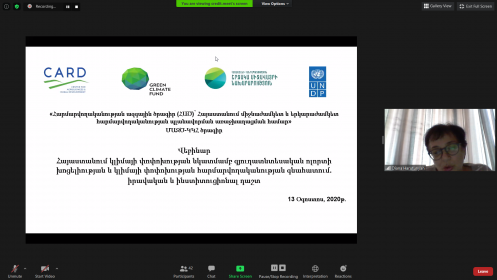 Results of the “Armenia assessment of agricultural sector vulnerability to climate change and climate change adaptation: legal and institutional framework” study conducted in the frame of the NAP project were presented to the participants of the webinar. The assessment was implemented by “CARD Agroservice” in the frame of UNDP-GCF Armenia’s National Adaptation Plan (NAP) project.